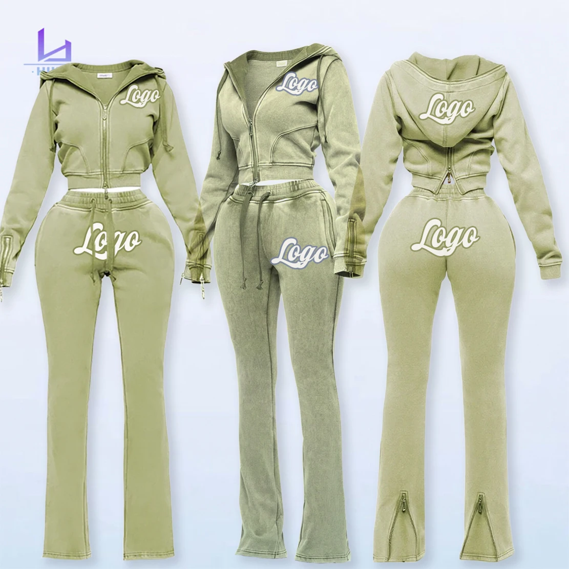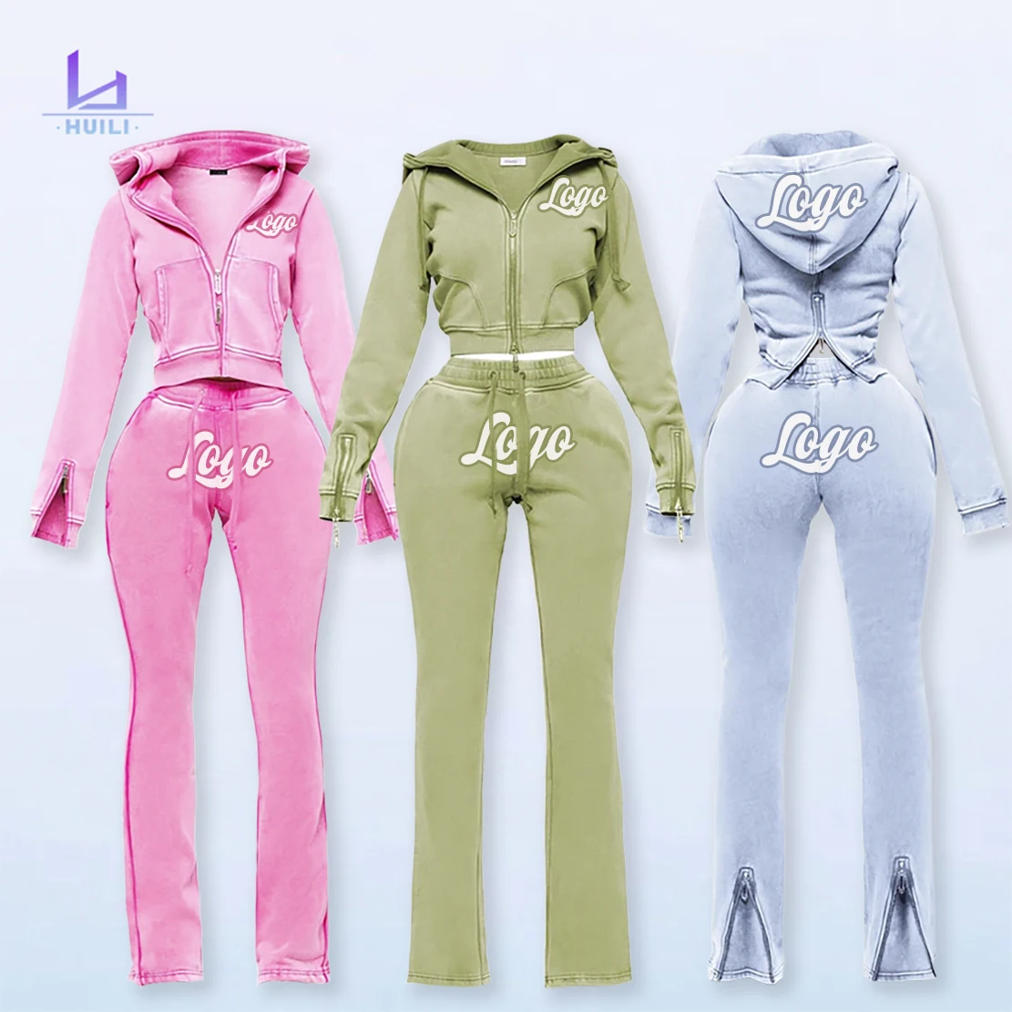 Huili French Terry Zip up Hooded Jacket Pants Custom Vintage Acid Wash Blank Two Piece Sweatpants and Crop Hoodie Set for Women